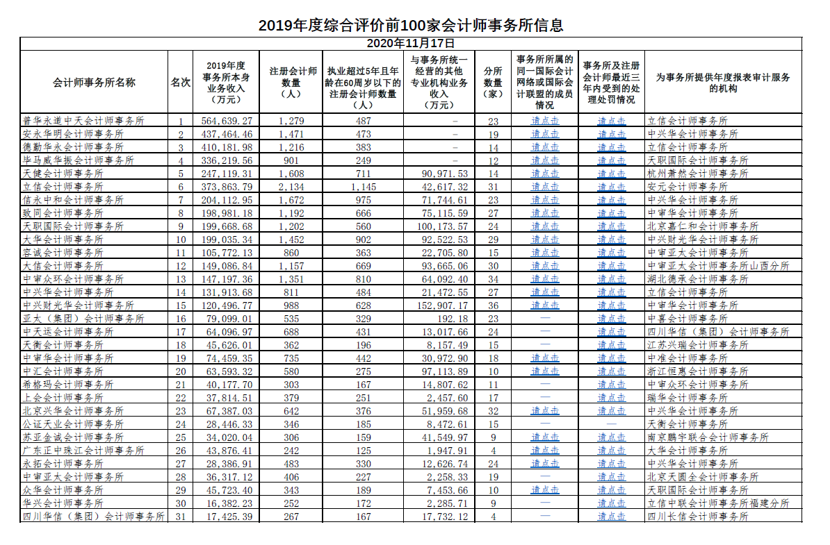 中国注册会计师协会发布《2019年度综合评价前100家会计师事务所信息》